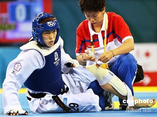 8月21日,在北京奧運(yùn)跆拳道女子57公斤級(jí)預(yù)賽中,中華臺(tái)北選手蘇麗文(左)對(duì)陣韓國(guó)林秀貞,蘇麗文在比賽中膝蓋受傷數(shù)次跌倒,防護(hù)員上場(chǎng)防護(hù)時(shí),蘇麗文神情相當(dāng)痛苦,但仍撐到比賽結(jié)束。 中新社發(fā) chinatimes 攝