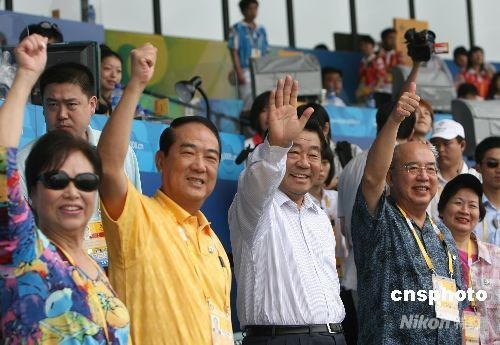 8月13日,北京奧運(yùn)會(huì)棒球比賽揭幕戰(zhàn)在中華臺(tái)北隊(duì)和荷蘭隊(duì)之間舉行,中共中央政治局常委賈慶林與中國(guó)國(guó)民黨主席吳伯雄、親民黨主席宋楚瑜到現(xiàn)場(chǎng)觀戰(zhàn),共同為中華臺(tái)北棒球隊(duì)加油。 中新社發(fā) 武仲林 攝