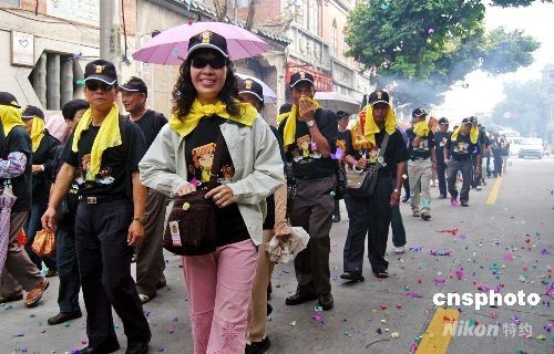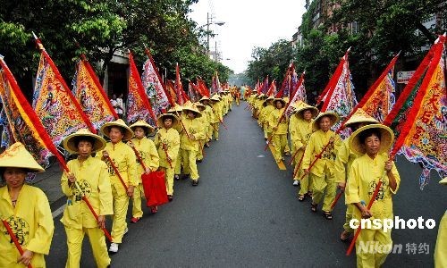 九月七日上午,僑鄉(xiāng)泉州鞭炮燃放、鑼鼓喧天,鹿港天后宮進香團三百多名信眾來到泉州謁祖進香。鹿港天后宮進香團于2006年和2007年連續(xù)兩年在泉州舉行會香活動,增進了兩地之間的交流和友誼。今年是該進香團第三次來泉,在臺灣被稱為“圓滿年”,因此,他們特地恭請來鹿港天后宮鎮(zhèn)殿媽祖。圖為開道隊伍排滿整條中山南路。 中新社發(fā) 傅丹丹 攝