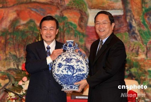 會(huì)見后,俞正聲向訪問團(tuán)贈(zèng)送了清乾隆時(shí)期景德鎮(zhèn)青花扁瓶珍貴高仿品。訪問團(tuán)則回贈(zèng)了《事事如意》金箔工藝畫和臺(tái)灣特色的鶯歌陶瓷瓶,瓶名為“和諧共贏”。