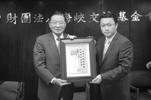 考察團(tuán)團(tuán)長(zhǎng)李偉杰向江丙坤致送紀(jì)念品。(圖片來源:澳門日?qǐng)?bào))