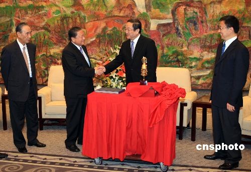 11月6日晚,中共中央政治局委員、上海市委書記俞正聲(圖右二)與市委副書記、市長(zhǎng)韓正(右一)在上海西郊賓館會(huì)見了臺(tái)灣大企業(yè)董事長(zhǎng)參訪團(tuán)一行 該參訪團(tuán)由臺(tái)達(dá)集團(tuán)董事長(zhǎng)鄭崇華、國泰世華銀行董事長(zhǎng)汪國華、遠(yuǎn)東集團(tuán)董事長(zhǎng)徐旭東、英業(yè)達(dá)集團(tuán)董事長(zhǎng)李詩欽等“重量級(jí)”臺(tái)商組成。會(huì)后,俞正聲與韓正向臺(tái)灣大企業(yè)董事長(zhǎng)參訪團(tuán)贈(zèng)送了神舟七號(hào)飛船實(shí)體模型和神舟七號(hào)航天郵品等紀(jì)念品。 中新社發(fā) 湯彥俊 攝