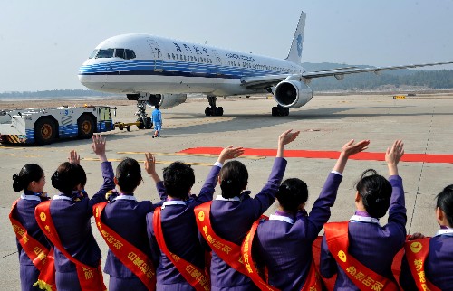 12月18日,廈門航空地面乘務(wù)人員在福州長(zhǎng)樂國際機(jī)場(chǎng)為兩岸空中直航包機(jī)送行。 當(dāng)日12時(shí)40分,搭乘著196名乘客的兩岸空中直航包機(jī)從福州長(zhǎng)樂國際機(jī)場(chǎng)首飛臺(tái)北松山機(jī)場(chǎng),標(biāo)志福州至臺(tái)灣空中客運(yùn)直航正式開通。 新華社記者 張國俊 攝