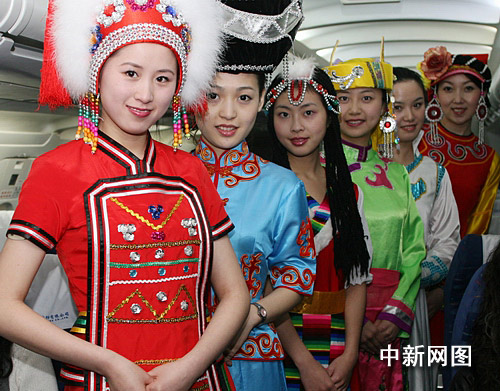 “民族之花”乘務(wù)組是川航精品乘務(wù)組之一,以乘務(wù)員身著民族服裝為服務(wù)特色,寓意中華民族的團結(jié)友愛。執(zhí)行臺北首航航班的乘務(wù)員將分別身著藏族、羌族、彝族、維族、傣族、蒙族、高山族服裝和代表天府四川特色的蜀繡蜀錦旗袍。去程,將為旅客表演舞蹈“阿里山的姑娘”,為旅客介紹臺灣的著名景點、風土人情、以及獨具特色的臺灣歌仔戲與布袋戲等。返程為臺灣旅客表演“太陽出來喜洋洋”等歌曲和舞蹈,以及介紹四川九寨溝、峨眉山等精品旅游線路。。