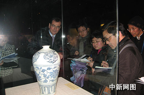 圖為臺(tái)北鴻禧美術(shù)館館長詹姆斯·史彬士介紹元代青花牡丹紋梅瓶。作 者:艾啟平
