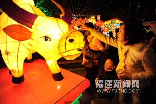 圖為市民津津樂道地在福州馬尾羅星塔公園欣賞“牛轉(zhuǎn)乾坤”大型花燈。