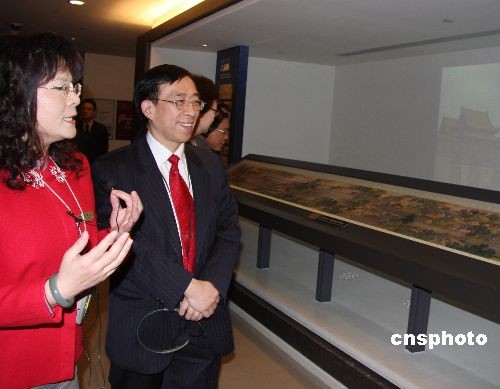 2月26日,上海博物館館長陳燮君(中)一行應邀抵達臺北參訪。圖為陳燮君一行在臺北故宮參觀,聽工作人員介紹結合了聲光效果的《清明上河圖》復制品。 中新社發(fā) 路梅 攝