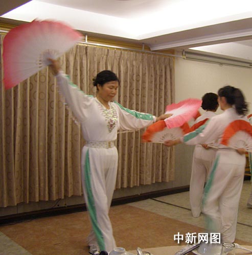 火爆臺灣熱舞后,在一陣陣江南絲竹聲中大陸老年游客手持木蘭扇翩翩起舞,雖然是在嘈雜的餐廳,照樣有板有眼,掌聲不斷。
