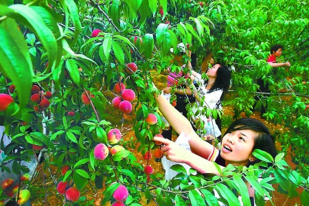 5月22日,幾位福州游客在閩侯龍臺(tái)山生態(tài)園桃林里采摘臺(tái)灣平地水蜜桃。前兩年,龍臺(tái)山引種了臺(tái)灣平地水蜜桃品種100多畝,今年迎來豐收,預(yù)計(jì)產(chǎn)量將達(dá)2萬公斤。這是閩臺(tái)農(nóng)業(yè)交流的又一成果。記者 祝敏松 攝
