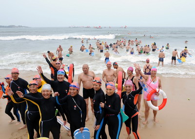 時斷時續(xù)的小雨并沒有澆滅參賽選手的運動激情。中午12時30分左右,海峽兩岸的游泳健兒相繼躍入水中,與風(fēng)浪展開搏擊。來自臺灣的陳建國已經(jīng)70歲,臨出發(fā)前他自信地說:“平時我一次能游3000米,今天這里2000多米的距離,不在話下!”