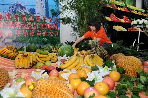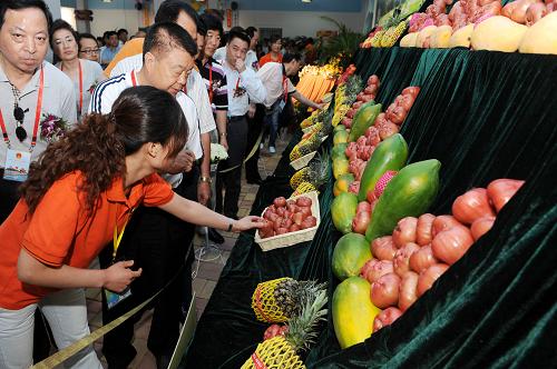 5月30日,工作人員在為客商介紹臺灣水果。當(dāng)日,青島“海峽兩岸精品水果展”開幕。參展臺灣水果直接從臺灣省臺南縣玉井鄉(xiāng)運(yùn)抵青島,包括芒果、蓮霧、番石榴、鳳梨等10多個品種,吸引眾多商家前來洽談。新華社記者 李紫恒 攝