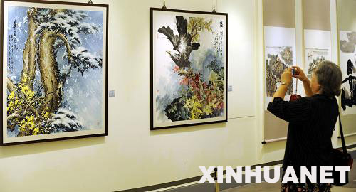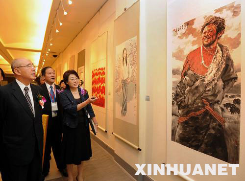 當日,2009當代國畫名家作品展在臺北市開幕,展出兩岸國畫名家作品140幅。中國國民黨主席吳伯雄與來自大陸的中國美術(shù)家協(xié)會主席劉大為等為畫展剪彩揭幕。新華社發(fā)(吳景騰 攝)