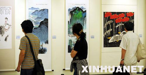 6月6日,2009當代國畫名家作品展在臺北市開幕,展出兩岸國畫名家作品140幅。中國國民黨主席吳伯雄與來自大陸的中國美術(shù)家協(xié)會主席劉大為等為畫展剪彩揭幕。這是參觀者在觀看畫展。新華社發(fā)(吳景騰 攝)