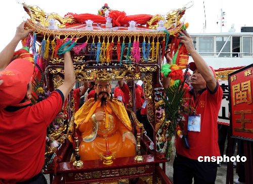 中新社福州六月二十八日電(記者 劉可耕)二十八日下午,由福州晉安區(qū)“閩臺王審知研究會”組織的福州市閩王金身巡安臺灣暨宗親文化交流訪問團(tuán)一行圓滿結(jié)束為期十天的閩王金身首次跨海巡安臺灣本島交流活動,搭乘“金龍輪”經(jīng)“兩馬”航線返回福州。