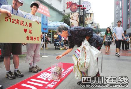 一位80多歲的老人,平時出門連礦泉水也舍不得買,一年時間只買了一件20元的襯衣,卻將平時省吃儉用的1000元善款捐給了受災的臺灣同胞;在杭州城站一家酒店打工的何小金一月收入只有1000多元,昨天一大早,第一個趕到杭州慈善總會,把上個月省下來的200元錢捐給受災的臺灣同胞……