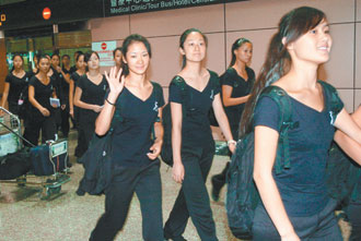 中新網(wǎng)9月1日電 據(jù)臺灣《聯(lián)合報》報道,大陸“千手觀音”表演團(tuán)84人由團(tuán)長邰麗華帶領(lǐng),昨天下午搭乘兩岸直航定期航班從北京飛抵桃園機(jī)場,將在臺北聽障奧運(yùn)開幕典禮中表演。