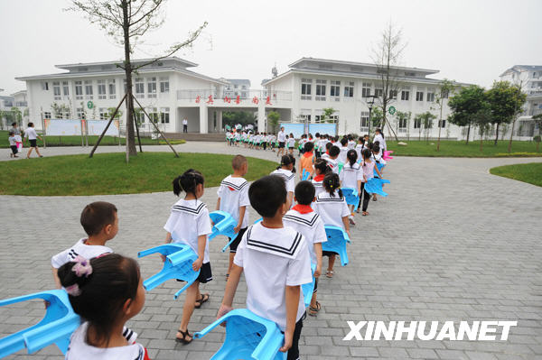 9月1日,都江堰頂新新建小學(xué)的學(xué)生們搬入新校舍。
