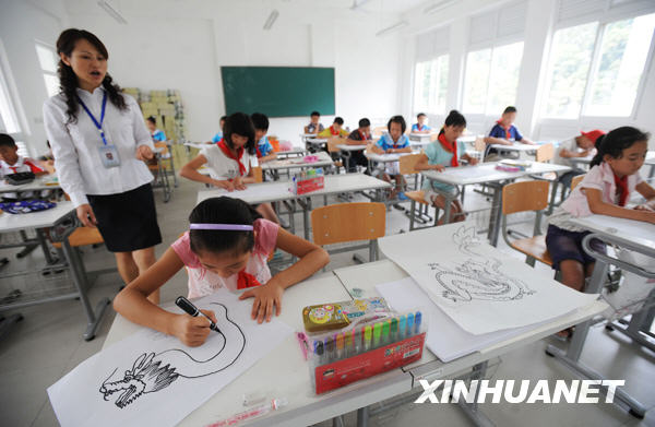 9月1日,都江堰頂新新建小學(xué)的學(xué)生正在上新學(xué)期的第一堂美術(shù)課。 新華社記者 江宏景攝