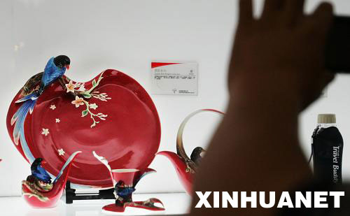 9月1日,參觀者正在為臺灣的陶器作品《鵲躍》拍照。