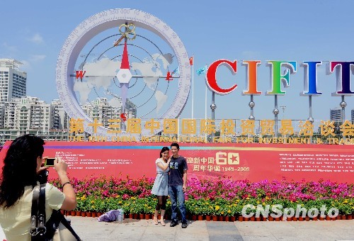 9月6日,市民在廈門國際會展中心的一處中國國際投洽會主題景觀前合影。9月8日上午,第十三屆中國國際投資貿(mào)易洽談會將在廈門國際會展中心開幕。 中新社發(fā) 劉可耕 攝