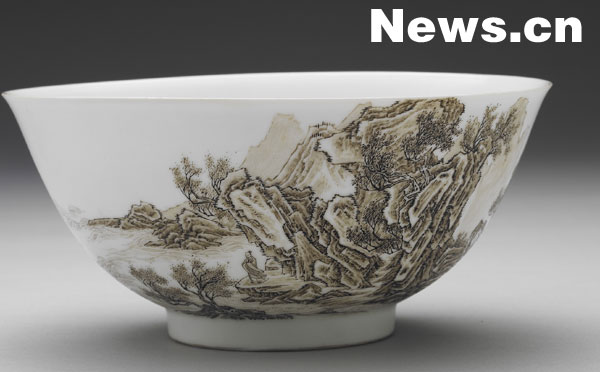 清 雍正 瓷胎畫琺瑯赭墨山水碗(圖片由臺(tái)北故宮提供)