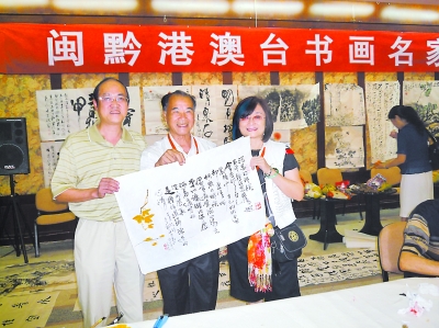 展廳里熙熙攘攘,兩張數(shù)米長的畫案上散放著毛筆、墨汁、顏料、印泥、印章,來自海峽兩岸的書畫家們正忙著潑墨揮豪,許多圍觀的書畫愛好者看得興味盎然。當中最興奮的當屬貴州省文化交流中心秘書長崔鍵(左一)了,因為他將是那副詩書畫的獲贈者。說起那副作品,崔鍵感慨道:這里頭凝著一份“緣”。