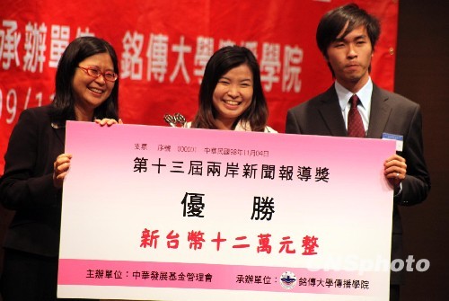 11月4日,由臺(tái)灣中華發(fā)展基金會(huì)主辦的第十三屆兩岸新聞報(bào)道獎(jiǎng)在臺(tái)北舉行頒獎(jiǎng)典禮,臺(tái)當(dāng)局“陸委會(huì)”主委賴幸媛為獲得電視新聞報(bào)道獎(jiǎng)的客家電視臺(tái)記者林秋伶、徐榮俊頒獎(jiǎng)。 中新社發(fā) 李佳佳 攝