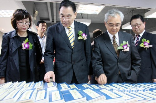 11月17日,包括當(dāng)今中國出版界最珍貴、史學(xué)界公認(rèn)最權(quán)威的二十四史版本《百衲本二十四史》在內(nèi),2000余種皖版精品圖書17日起在臺(tái)北市上海書店展出六天。圖為率團(tuán)訪臺(tái)的安徽皖臺(tái)交流協(xié)會(huì)名譽(yù)會(huì)長臧世凱(左2)在參觀書展之《百衲本二十四史》。 中新社發(fā) 黃少華 攝