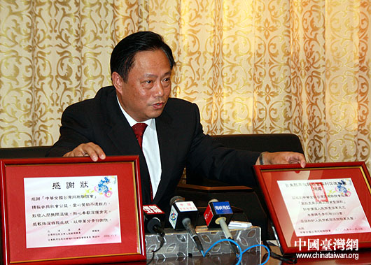 11月6日至10日,全國(guó)臺(tái)聯(lián)會(huì)長(zhǎng)梁國(guó)揚(yáng)率團(tuán)赴臺(tái)交流參訪,為臺(tái)灣少數(shù)民族鄉(xiāng)親送去賑災(zāi)款物。11月19日,梁國(guó)揚(yáng)回京后向記者通報(bào)此行參訪交流情況,并展示臺(tái)灣少數(shù)民族鄉(xiāng)親回送給全國(guó)臺(tái)聯(lián)的感謝狀等。(中國(guó)臺(tái)灣網(wǎng) 鐘寶華 攝)