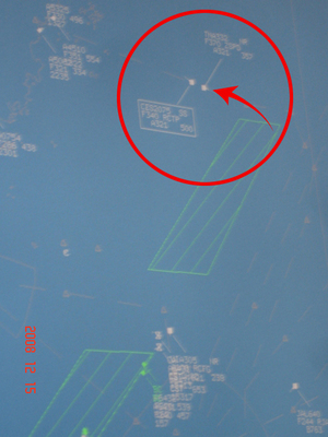資料圖片:兩岸15日起正式開啟平日包機,臺“民航局”臺北區(qū)管中心雷達屏幕,在上午8時47分顯示臺灣的復(fù)興航空與大陸的東方航空在新航路空中相遇。(圖:臺灣“中央社”)
