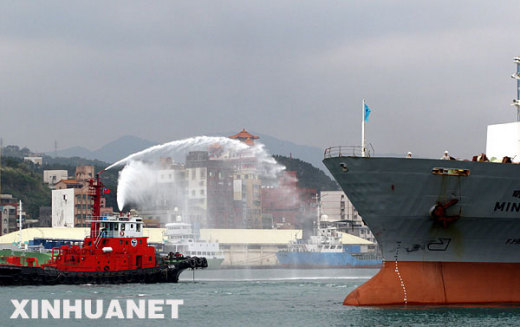 資料圖片:2008年12月15日,即將遠航的船舶接受噴水祝福。當(dāng)日,臺灣萬海航運、陽明海運、臺灣航業(yè)、福建華榮等4家航運公司聯(lián)合舉辦的兩岸海運直航基隆首航儀式在臺灣基隆港舉行。新華社記者 陳斌華攝