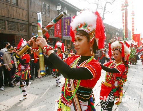 1月31日上午, 由中國(guó)文學(xué)藝術(shù)界聯(lián)合會(huì)、中國(guó)民間文藝家協(xié)會(huì)、福建省文學(xué)藝術(shù)界聯(lián)合會(huì)主辦的“中華情——海峽兩岸民間藝術(shù)嘉年華活動(dòng)”在福州三坊七巷開幕,兩岸民間表演隊(duì)伍聯(lián)合進(jìn)行踩街表演是其中的一項(xiàng)活動(dòng)。 中新社發(fā) 祝敏松 攝