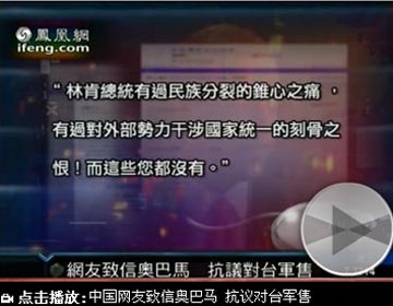 新華網(wǎng)消息 據(jù)鳳凰網(wǎng)報(bào)道,美國對(duì)臺(tái)軍售讓中美關(guān)系緊張,有網(wǎng)友在論壇上公開致信美國總統(tǒng)奧巴馬,表達(dá)對(duì)國家統(tǒng)一安定的向往,希望奧巴馬可以聽到來自中國網(wǎng)民的聲音。
