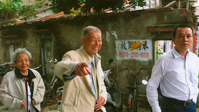 蔡騰芳的孫子蔡振德(右)帶領(lǐng)薛秋帆(中)夫婦觀看當(dāng)年躲難的住處。