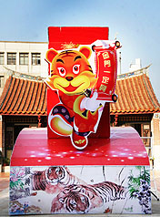 金門元宵燈會(huì)的主題燈“福虎生豐燈”,下午由金門縣文化局人員布置完成,高4.5公尺的虎燈,擺設(shè)在浯江書院的中庭,十分搶眼。