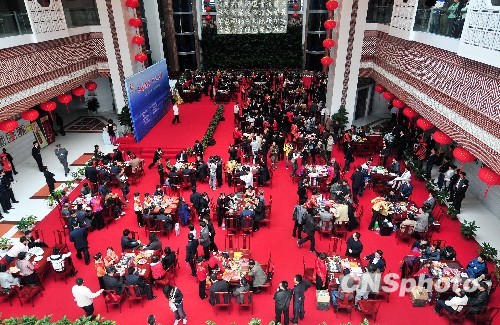 中新社泉州2月27日電 (詹托榮)27日上午,在中國閩臺緣博物館《同文、同種、同根生》的巨幅爆繪壁畫下,來自德國、美國、臺灣等國家和地區(qū)的上千名茶友坐在具有閩南特色的八仙茶桌前,共品福建名茶,共賞茶鄉(xiāng)民俗表演,共話源遠流長的兩岸茶緣。