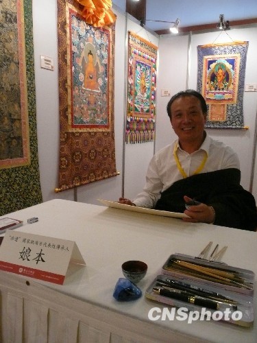 內(nèi)容豐富多彩的大美青海臺灣行活動16日拉開帷幕。作為推動兩岸交流的一次重要活動,青海副省長王令浚16日在臺北圓山飯店主持一場推介會,期盼有更多的臺商到青海投資,更多的臺灣旅客到青海旅游觀光。圖為青海著名唐卡藝術(shù)家在現(xiàn)場為來賓繪畫。 中新社發(fā) 閆曉虹 攝