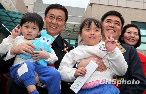 4月7日下午,上海市長韓正在臺北參觀完北投焚化場后,與凱撒琳托兒所的小朋友親切互動。圖為韓正(左)向小朋友贈送上海世博會吉祥物“海寶”,并笑著抱起一名小男孩,臺北市長郝龍斌則贈送小朋友“花博會”環(huán)保鉛筆。 中新社發(fā) 董會峰 攝