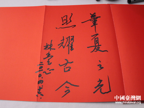 林豐正為黃帝故里題詞:華夏之光,照耀古今。圖片來源:河南省臺辦