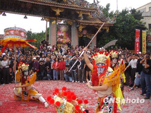兩岸信眾在臺北保安宮前為保生大帝慶生而舉辦的盛大民俗廟會藝陣表演從上午10時拉開帷幕,來自高雄的農民兄弟率先獻演一場精彩的“宋江陣”。而后車鼓陣、花鼓陣、高蹺陣、十二婆祖陣、八家將等傳統(tǒng)的閩南廟會表演藝陣也紛紛登場,數(shù)以千計的臺灣民眾駐足觀賞,保安宮廟埕前四周人頭攢動。