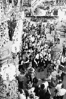 興濟(jì)宮還專設(shè)“宴王”,給予圣駕最高禮遇。數(shù)十平方米的大桌上有大龍蝦、烤乳豬等過百道各色食品。當(dāng)?shù)貙W(xué)生葉升融說起桌子正中最醒目的“山珍海味”,如數(shù)家珍,“用姜堆成的是‘山’,下面鋪著的紅豆綠豆代表了‘珍’,雪白的鹽就是‘!,‘味’則用紅糖表示!彼麑χ把缤酢辈粩喟磩涌扉T,說晚上就把照片傳到部落格上,和朋友們一起分享。