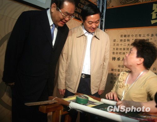 在川藝展區(qū),劉奇葆向同行的中國(guó)國(guó)民黨副主席曾永權(quán)介紹起了蜀繡 中新社發(fā) 鄒輝 攝