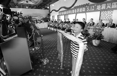 抗震救災小英雄林浩向臺灣媒體敬獻哈達和羌紅,感謝他們?yōu)榭拐鹁葹淖龀龅呢暙I。