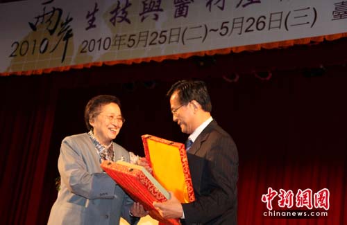 5月25日,前全國人大常委會副委員長、海峽兩岸醫(yī)藥衛(wèi)生交流協(xié)會名譽會長何魯麗,在臺北出席“兩岸生技與醫(yī)材產(chǎn)業(yè)合作及交流會議”。圖為何魯麗與臺灣方面代表互贈紀念品。記者 董會峰 攝