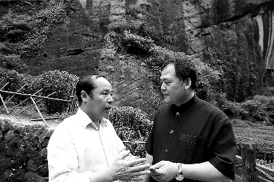 6月3日,臺(tái)灣阿里山茶葉合作社理事會(huì)主席王昭坤(右)到武夷山考察茶葉種植。王昭坤說(shuō),臺(tái)灣的凍頂烏龍茶來(lái)自武夷巖茶——大紅袍,武夷巖茶——大紅袍與阿里山凍頂烏龍都發(fā)自武夷山。 邱汝泉 攝
