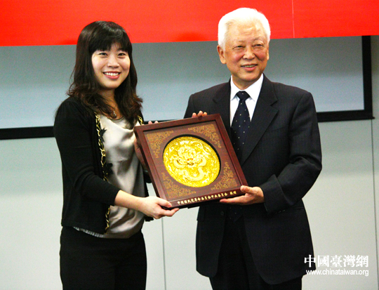周鐵農(nóng)代表民革中央向“中國(guó)國(guó)民黨青年菁英大陸參訪(fǎng)團(tuán)”贈(zèng)送紀(jì)念品(中國(guó)臺(tái)灣網(wǎng) 孫金誠(chéng) 攝)
