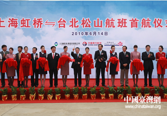 上海市副市長沈俊、臺北市長郝龍斌、民航總局副局長夏興華、東方航空與臺灣華航有關負責人及兩岸嘉賓百余人在機場出席了航班首航儀式,并為航線開通剪裁。