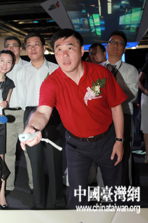 6月17日,臺北市長郝龍斌在“2010上海、臺北雙城文化創(chuàng)意產(chǎn)業(yè)博覽會”上體驗互動家庭娛樂系統(tǒng)。(中國臺灣網(wǎng) 田云鵬 攝)