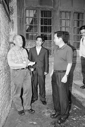 6月8日,在重走故宮文物南遷路途中,李文儒(左一)與當?shù)匚奈飳<铱疾飚斈甏娣盼奈锏馁F州毛(光翔)公館。照片由故宮博物院提供