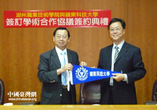 中國(guó)臺(tái)灣網(wǎng)7月2日湖州消息 日前,臺(tái)灣嶺東科技大學(xué)校長(zhǎng)陳振貴與湖州職業(yè)技術(shù)學(xué)院院長(zhǎng)胡世明簽訂合作協(xié)議,兩校正式結(jié)為姊妹學(xué)校。湖州職業(yè)技術(shù)學(xué)院的22名女生應(yīng)陳校長(zhǎng)的邀請(qǐng),將于2010年9月13日至2011年1月14日期間赴臺(tái)灣進(jìn)行交流學(xué)習(xí)。期間,將在臺(tái)灣嶺東科技大學(xué)選修18-20學(xué)分的課程進(jìn)行學(xué)習(xí)。
